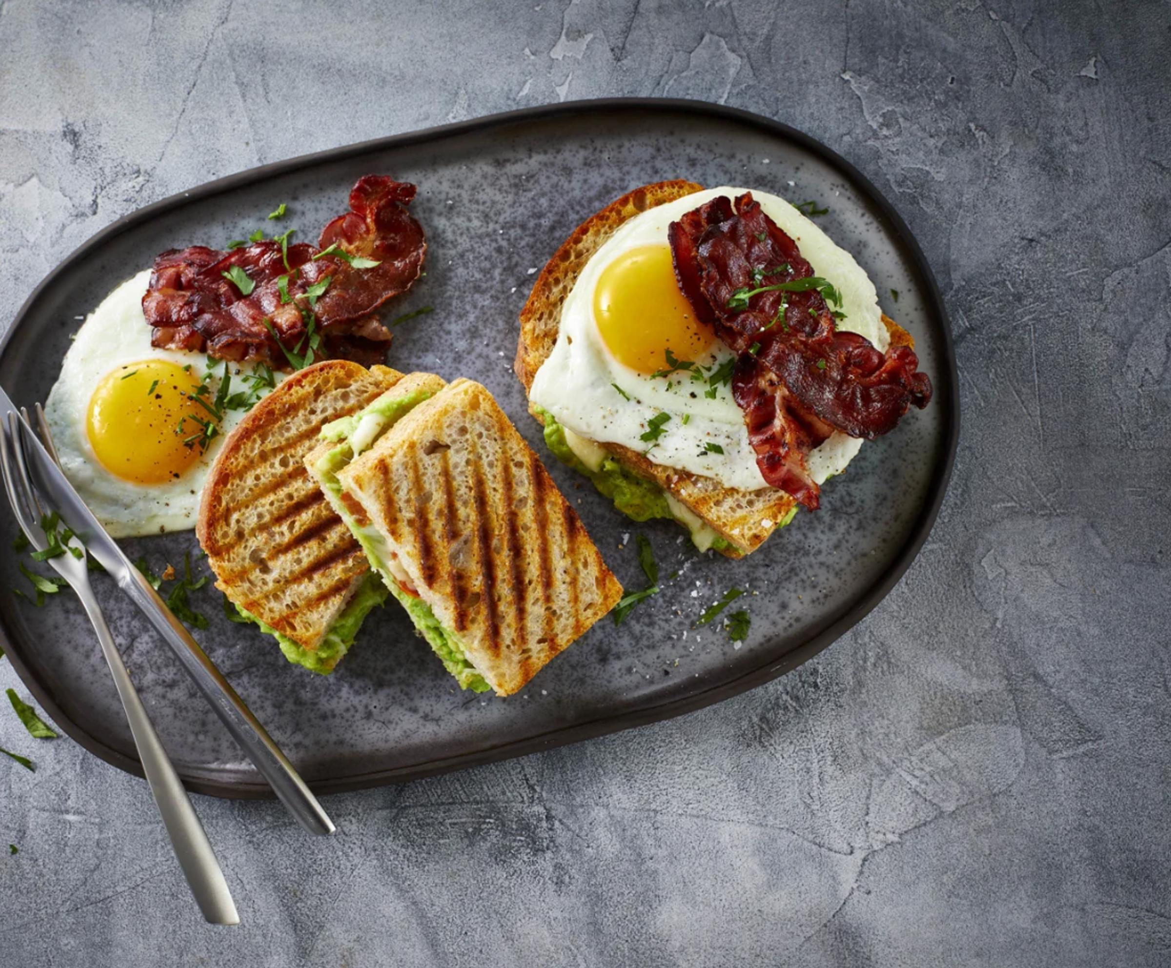 Enjoy a lovely avocado toast with fresh tomatoes and creamy Arla melted cheese. It is dressed to impress with fried bacon and eggs, as well as a light sprinkling of fresh parsley on top. The delicious sandwich makes a great addition to any breakfast or brunch table, with fresh and savoury flavours that are sure to brighten any meal.