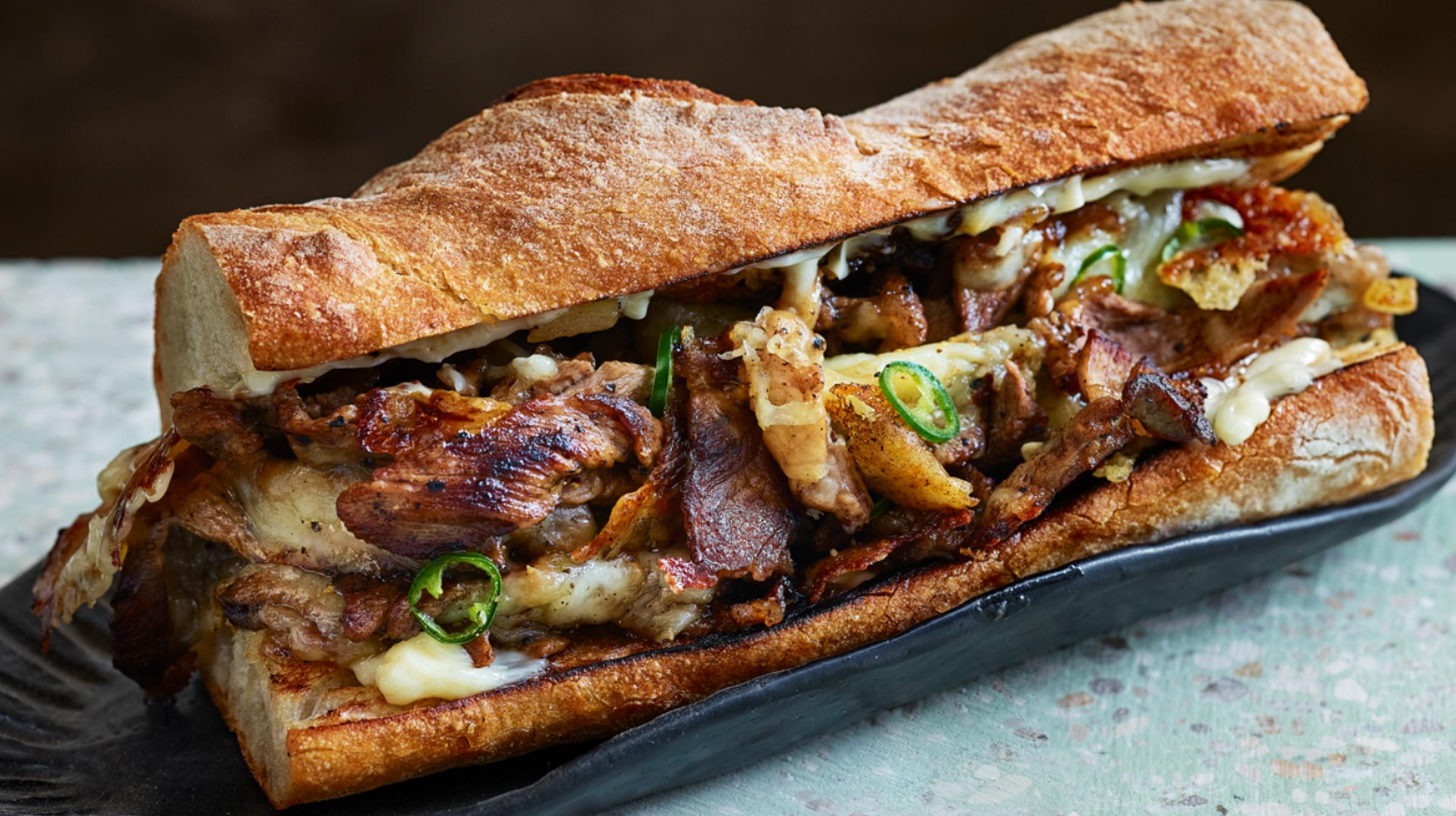 - Κόψτε τη μπαγκέτα στη μέση κατά μήκος. Αλείψτε με μαγιονέζα και γεμίστε με το κρέας.