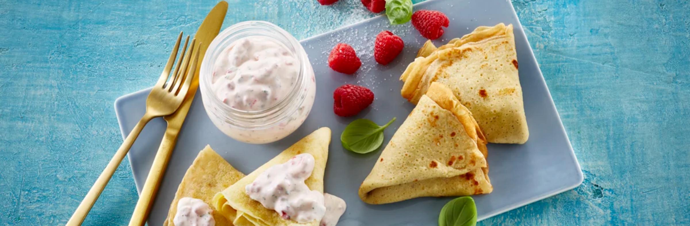 - Σερβίρετε τις τηγανίτες ζεστές, γαρνιρισμένες με τη μους, λίγη άχνη ζάχαρη, φρέσκα σμέουρα και φύλλα βασιλικού.